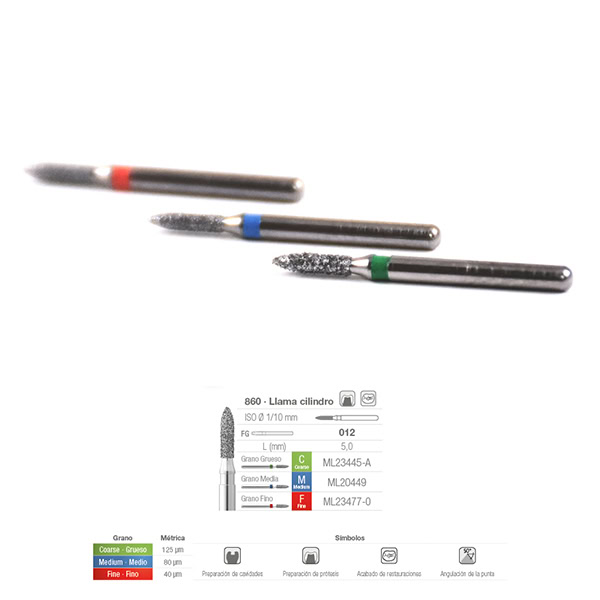 FRESA DE DIAMANTE FG PARA TURBINA CON FORMA DE LLAMA CORTA DE DIAMETRO 012 Y TAMAÑO DE GRANO GRUESO (COLOR VERDE).PRESENTACION EN BLISTER DE 5 UNIDADES.VELOCIDAD MAXIMA RECOMENDADA 100000 RPM.