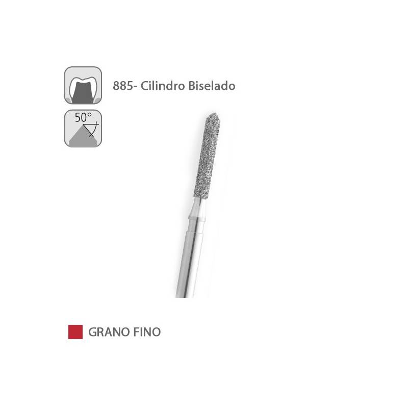 La fresa 885 de Medicaline es una fresa diamantada FG para turbina, con forma de cilindro biselado. El tamaño del grano es fino (color rojo).