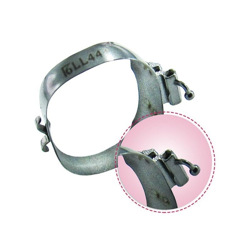 Con tubo doble y palometa inferior izquierda, en pieza dental número 46, disponible en diferente numeración de banda.