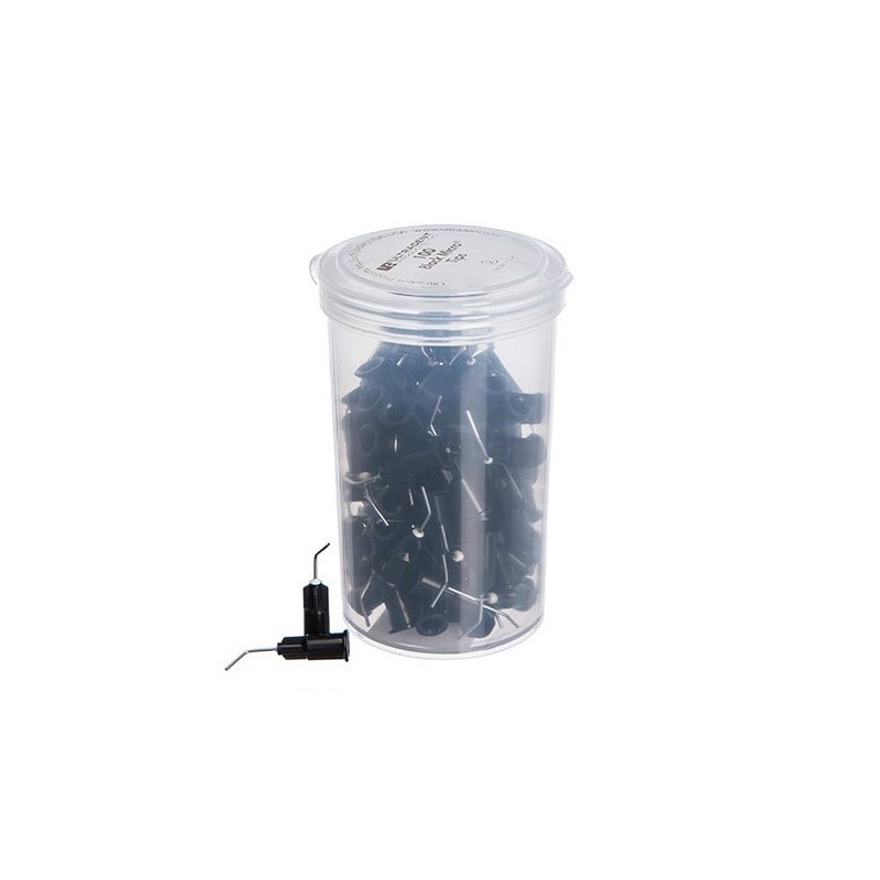 Puntas de Aguja Metálica Curvada de Gran Precisión, con fibras en el extremo, con las que se puede aplicar el material en una capa fina y uniforme. Para la aplicación de materiales ligeramente viscosos. Calibre 22 ( Ø 0,70 mm). Contenido: 100 puntas.