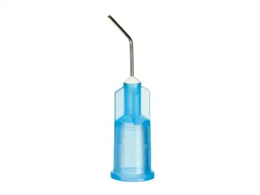 Cuerpo de plástico color azul claro con aguja metálica roma y curvada con cánula estrecha para una aplicación de los materiales precisa y controlada.