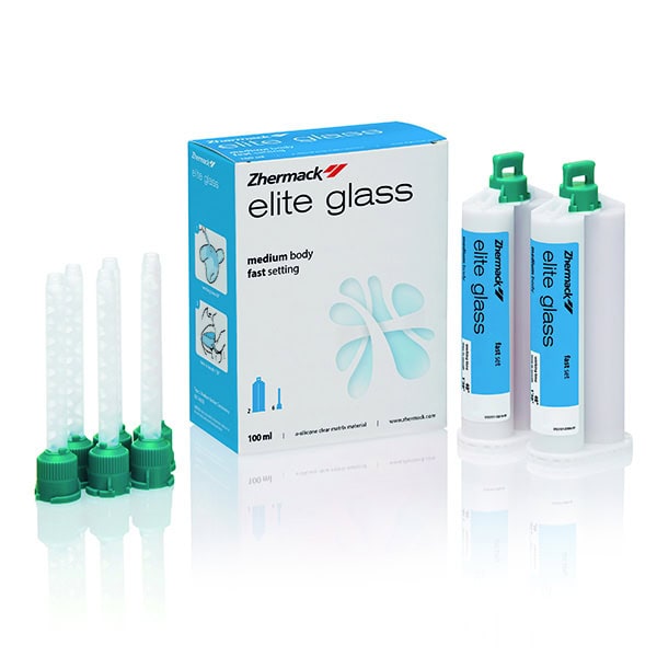 Elite Glass de Zhermack es una silicona de adición (polivinilsiloxano) de muy elevada transparencia, lo que permite su uso como matriz para la polimerización intra y extra oral de materiales tanto fotopolimerizables como de polimerización dual.