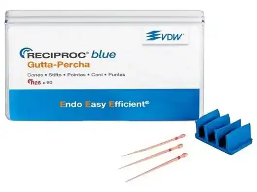 Gutapercha adaptada al sistema Reciproc. Buen ajuste a la preparación gracias a un procedimiento de fabricación por inyección.-phase con un punto de fusión bajo para técnicas de obturación tanto en frío como en caliente. Longitud 28 mm.Caja de 60 unidades.