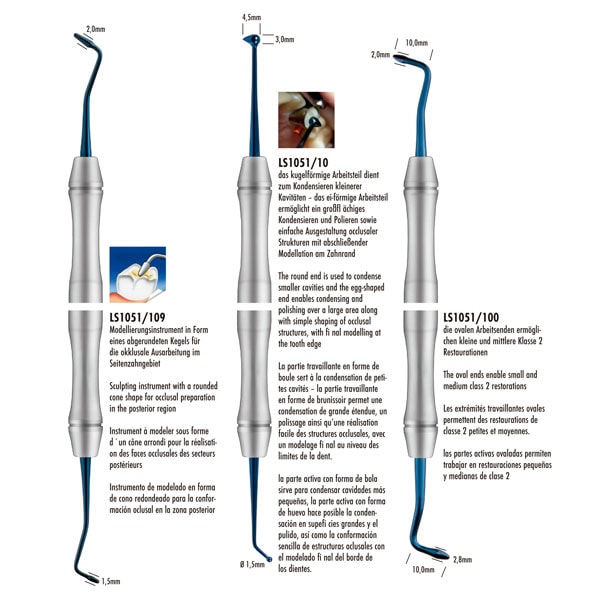 Doble parte activa. La parte con forma de bola (Ø 1,5 mm) sirve para condensar cavidades más pequeñas. Mientras que la que tiene forma de huevo (4,5mm 3,00mm) hace posible la condensación en grandes supeficies y el pulido, así como la conformación sencilla de estructuras oclusales con el modelado final del borde de los dientes.