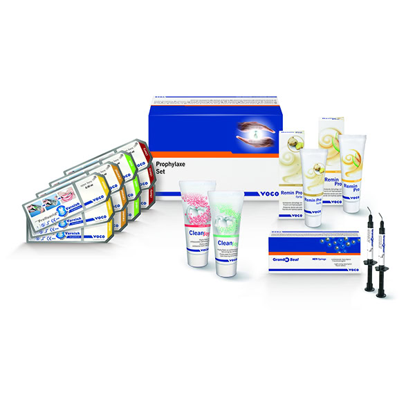 El Kit contiene los siguientes productos: CleanJoy, Remin Pro, Remin Pro forte, Profluorid Varnish SingleDose, Grandio Seal jeringa.