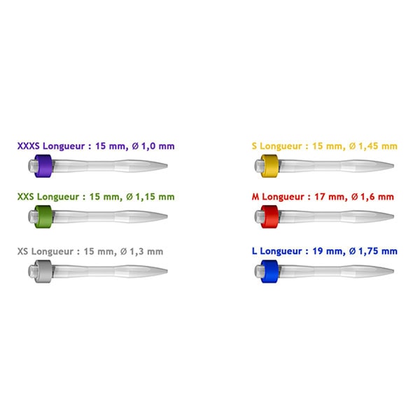 Disponibles en 5 tamaños con longitudes y diámetros diferentes, codificados por color: