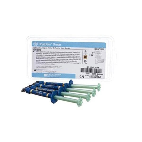 OpalDam, en blanqueamientos, aisla el tejido adyacente a los dientes o en caso de pretender blanquear una sola pieza dentaria proteger las piezas adyacentes. Seque completamente la encía antes de aplicar. Es suficiente con fotopolimerizar sólo unos 10-20 segundos por diente.
