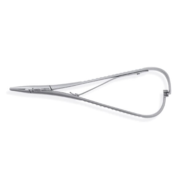 Porta agujas Mathieu con cierre de tipo cremallera por lo que mantiene una gran presión y además tiene pequeñas estrías en su punta para más sujeción.