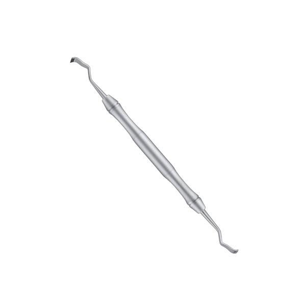 Cincel curvado con doble parte activa de diferentes medidas: 4 mm y 6 mm de ancho, respectivamente que tienen la forma de una paleta curvada.
